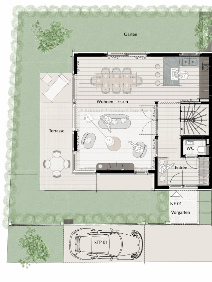 Aber fangen wir von vorne an: Entrée des Townhouses bildet eine charmante Garderobe mit gemütlicher Sitznische, die den Blick auf den großen Wohnbereich mit offener Küche, Essecke und fantastischem Ausblick auf den Garten bzw. die Terrasse freigibt. Dann geht’s hoch hinaus: Zunächst ins 1.OG, hier warten zwei Schlaf-, ein Arbeitszimmer sowie ein geräumiges Tageslichtbad auf Ihre Liebsten. Das Schönste haben Sie allerdings noch nicht gesehen: Ihr persönliches Reich im 2. OG mit Masterbedroom, Ankleide, Bad ensuite und eigener Dachterrasse. Jetzt müssen Sie sich nur entscheiden: Welches Zimmer möchten Sie in Gedanken als erstes einrichten?