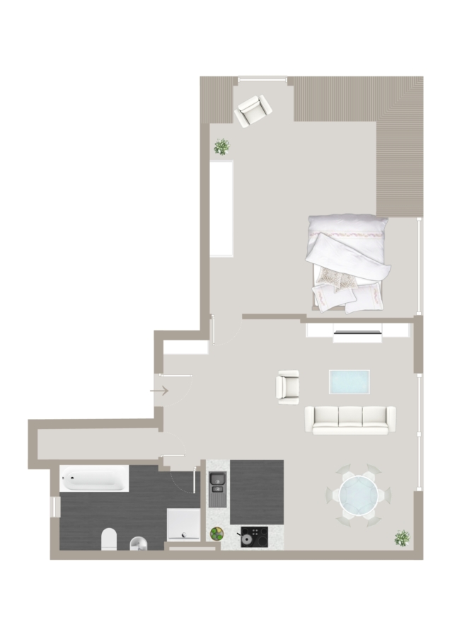 Die offene Küche im Industrial Design setzt ein stilvolles Statement und unterstreicht den urbanen Charakter dieser außergewöhnlichen Wohnung. Clevere Einbauschränke im Eingangsbereich sorgen für Ordnung, ohne die Ästhetik zu stören.