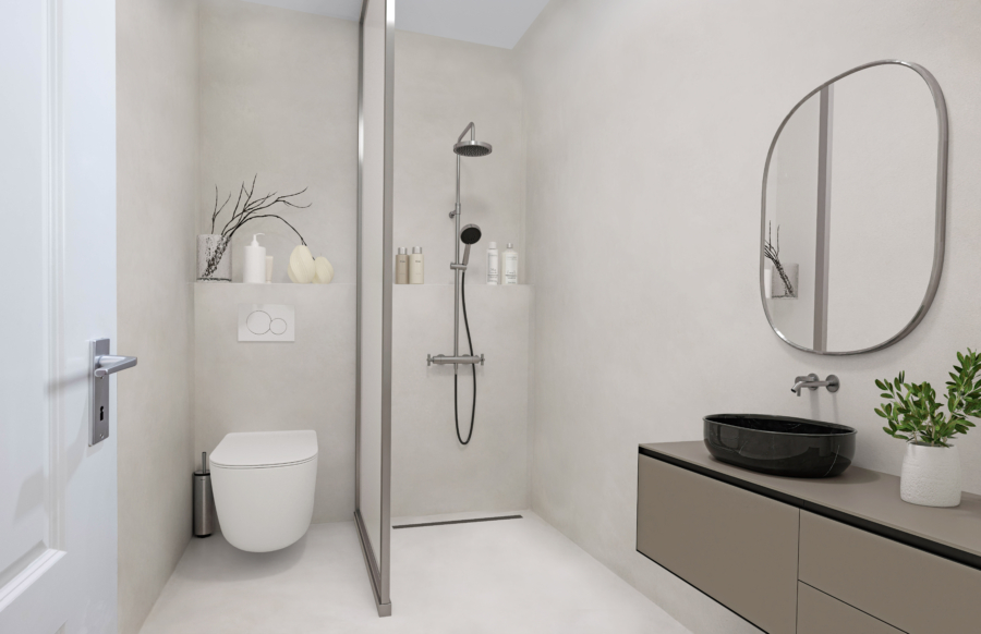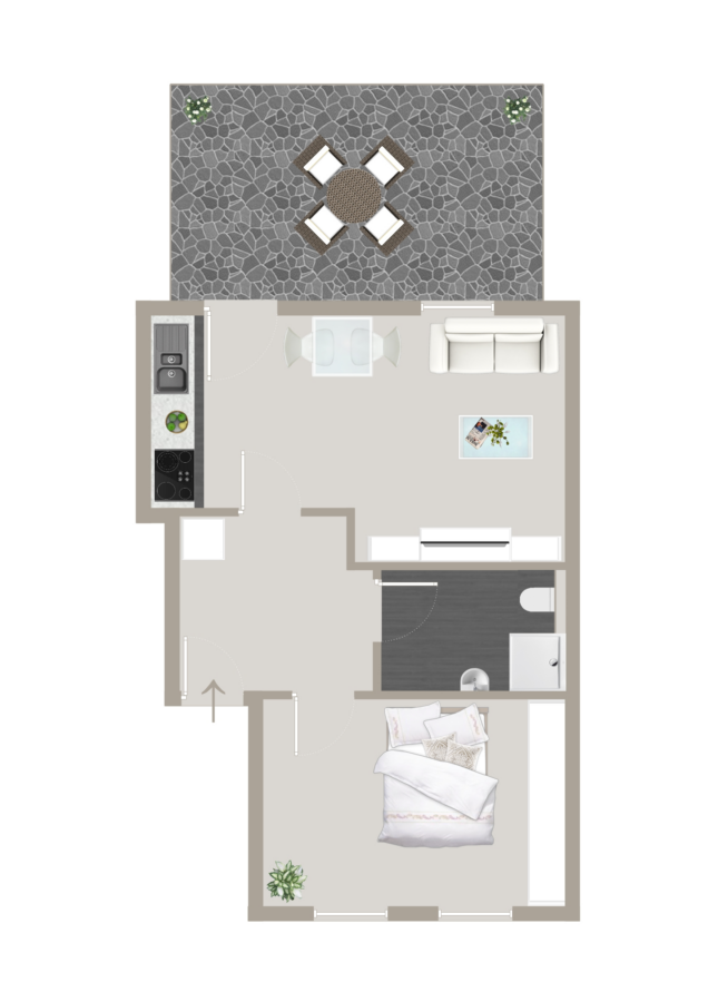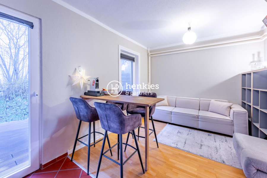 Die Wohnung verfügt über ein gut geschnittenes Schlafzimmer, ein modernes Badezimmer mit Dusche und hellen Fliesen sowie einen offen und praktisch gestalteten Wohnbereich. Der Laminatboden verleiht den Wohnräumen eine zeitlose und wohnliche Atmosphäre. In der Küche und im Flur sind dunkle Fliesen verlegt, die vorhandene Einbauküche ist im Kaufpreis enthalten und fügt sich harmonisch in das Gesamtbild der Wohnung ein. Von hieraus gelangen Sie auf die Terrasse mit Blick ins Grüne, welche sich ideal für gemütliche Abende mit Freunden oder Familie anbietet.