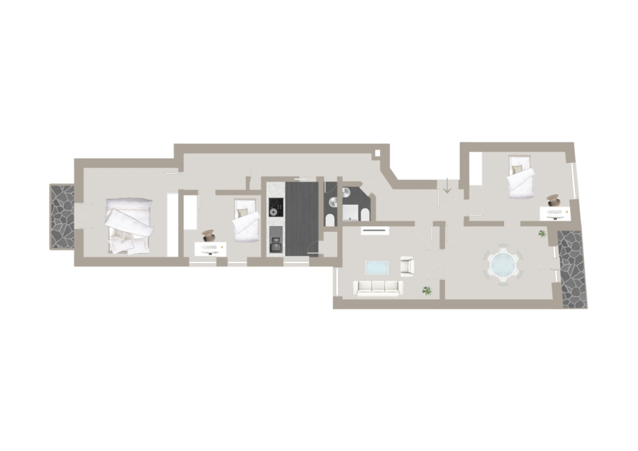 Der Grundriss überzeugt mit einem zentralen, weitläufigen Flur, von dem aus alle Räume harmonisch erschlossen werden. Großzügige Fensterflächen sorgen für ein angenehmes Licht- und Raumgefühl, während die beiden Balkone den Wohnbereich um charmante Rückzugsorte im Freien ergänzen – perfekt für den ersten Kaffee am Morgen oder einen entspannten Abend im Sonnenuntergang.