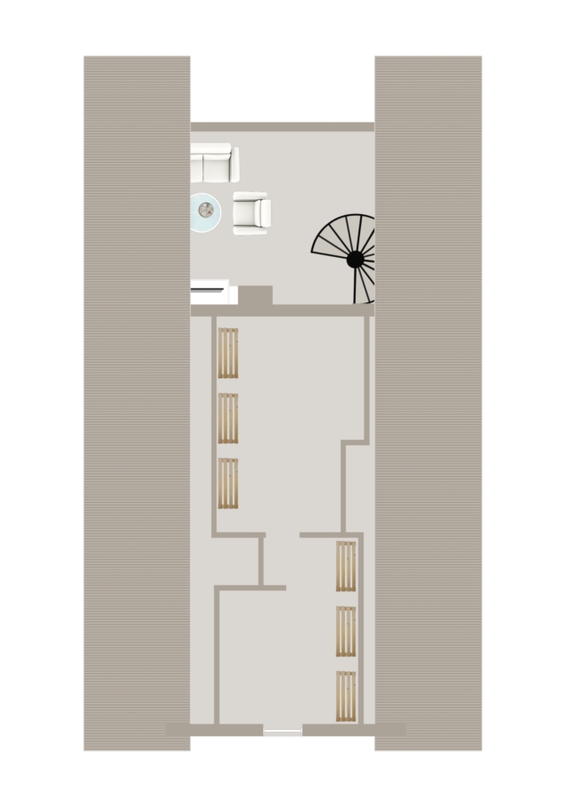 Eine Treppe führt in das darüberliegende Geschoss, wo sich der gemütliche Wohnbereich befindet. Hohe Decken und eine offene Balkendecke verleihen diesem Raum eine besonders wohnliche Atmosphäre und unterstreichen den individuellen Charakter der Wohnung. Von hier aus besteht zudem Zugang zu einem Balkon, der einen schönen Platz zum Entspannen bietet.