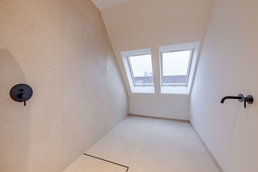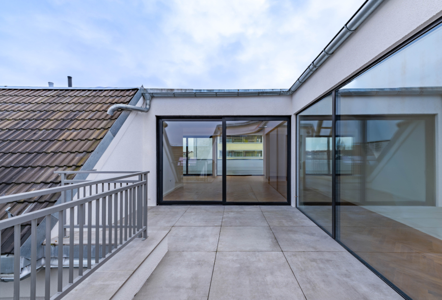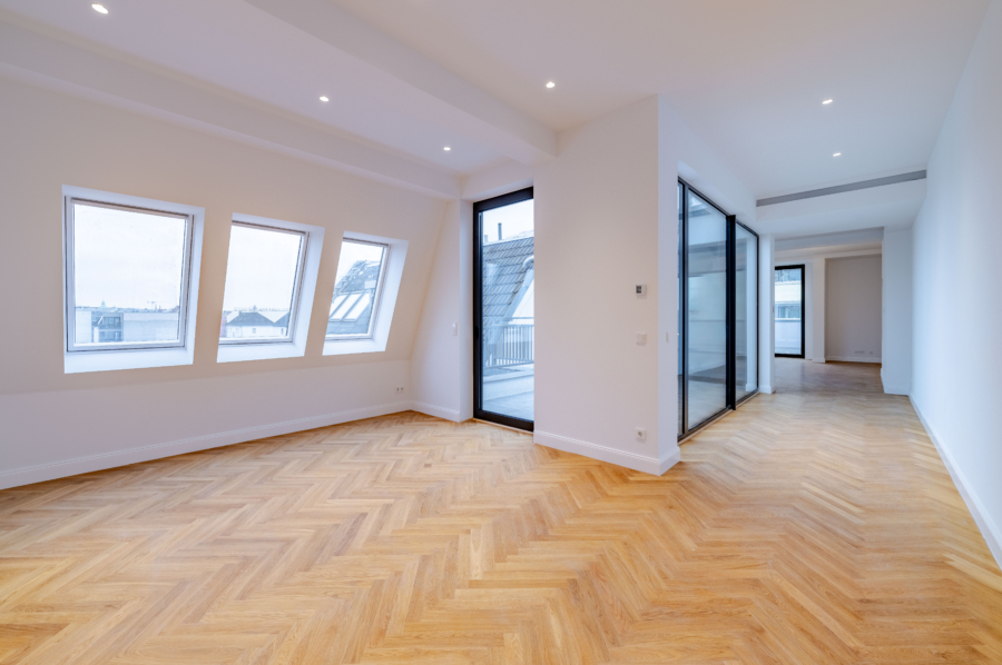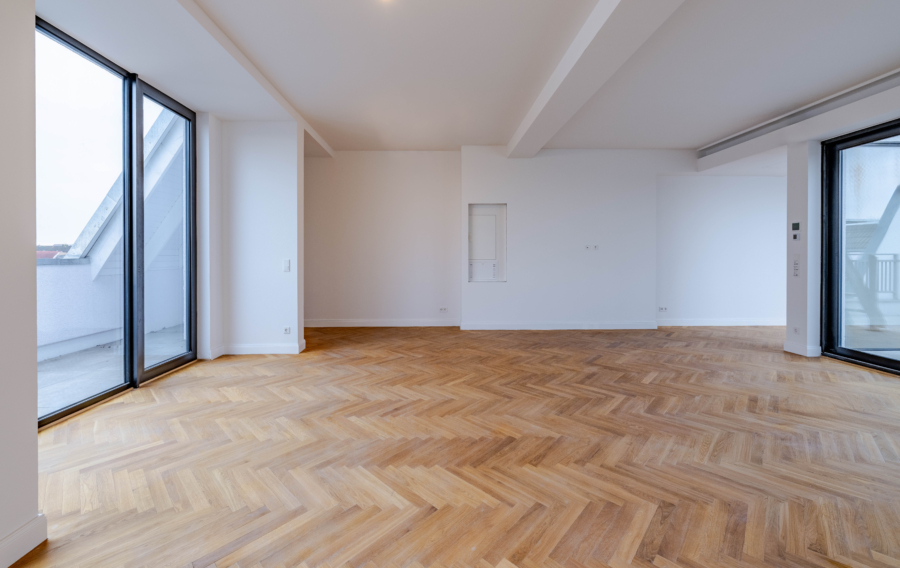 Im Mittelpunkt steht der rund 76 m² große Wohnbereich mit offener Küche, der durch seine eindrucksvolle Deckenhöhe und bodentiefe Fenster eine nahezu loftartige Atmosphäre schafft. Von hier aus eröffnet sich der Zugang zu mehreren Terrassen, die den Blick über die Stadt freigeben und ein Panorama bieten, das zu jeder Tageszeit beeindruckt.