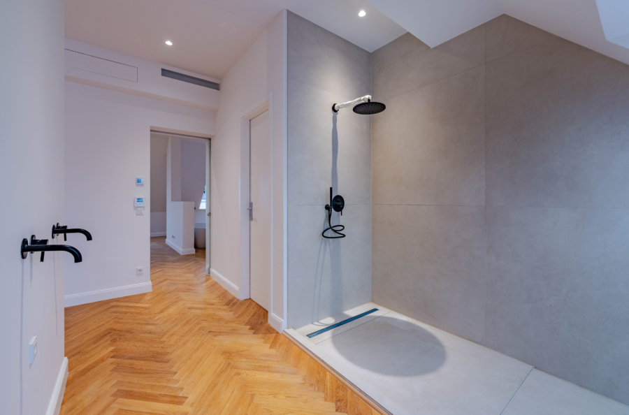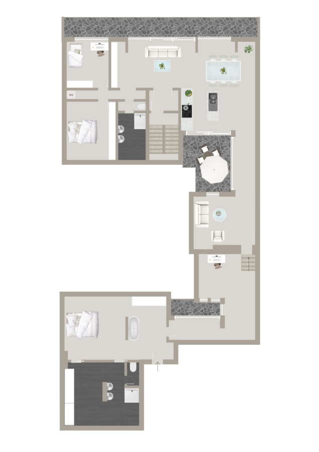 Der private Bereich ist ebenso durchdacht wie exklusiv gestaltet. Ein großzügiger Masterbereich mit ca. 48 m², Bad en Suite, freistehender Badewanne und Ankleidebereich bildet eine eigene Rückzugsebene. Ergänzt wird das Raumangebot durch mehrere weitere Zimmer, die individuell als Kinderzimmer, Gästebereich oder Homeoffice genutzt werden können. Die halb offenen Raumstrukturen schaffen dabei fließende Übergänge zwischen Wohnen, Arbeiten und Rückzug und unterstreichen den modernen, urbanen Charakter der Wohnung.