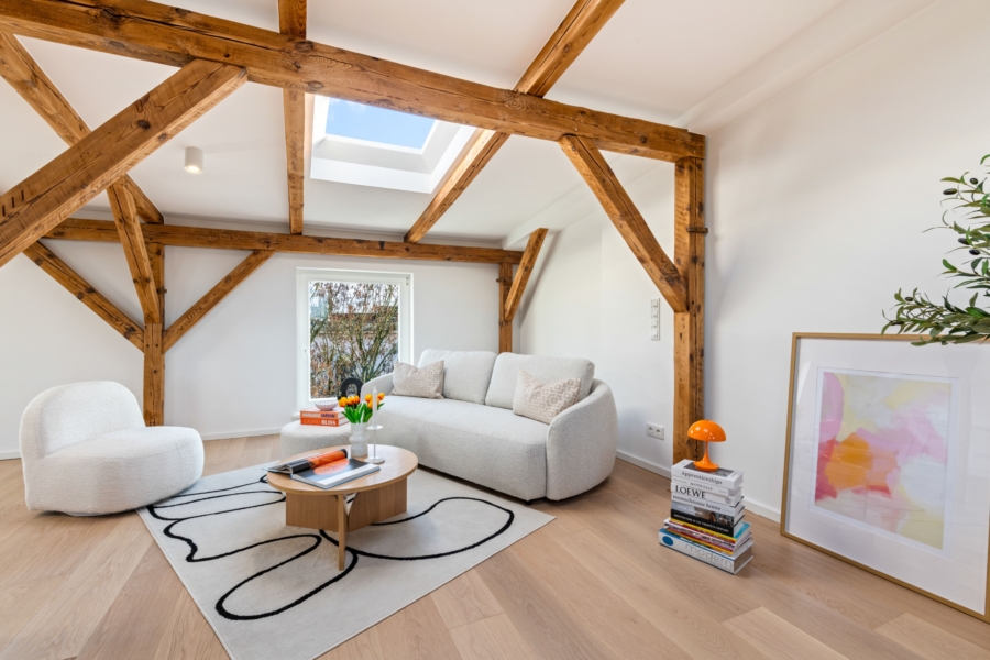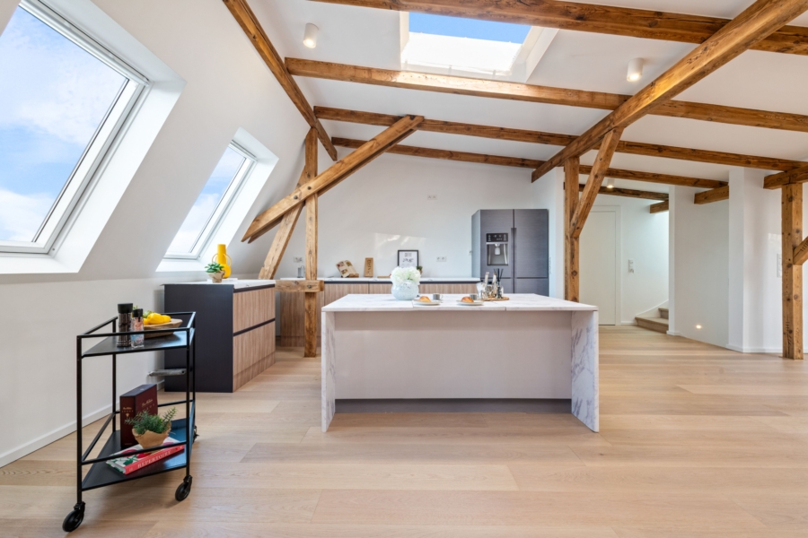 Dieses Maisonette-Penthouse entstand 2024 im Rahmen des hochwertigen Dachgeschossausbaus des denkmalgeschützten Jugendstilgebäudes und