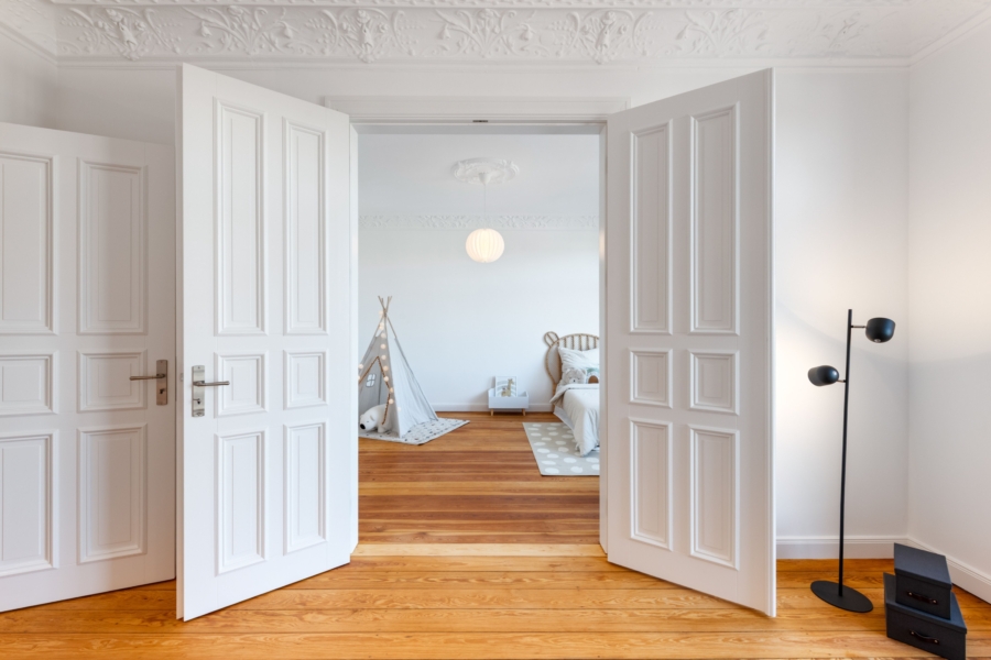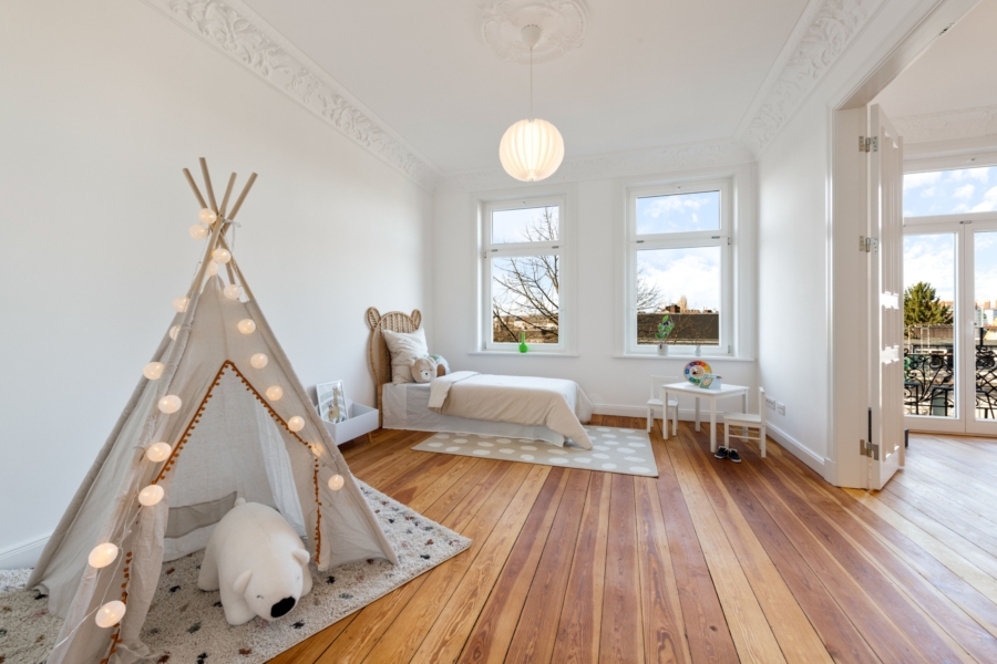 Dielenboden verleihen den Räumen eine warme und elegante Atmosphäre. Drei große Zimmer – ideal als Schlafzimmer, Büro oder Kinderzimmer – bieten