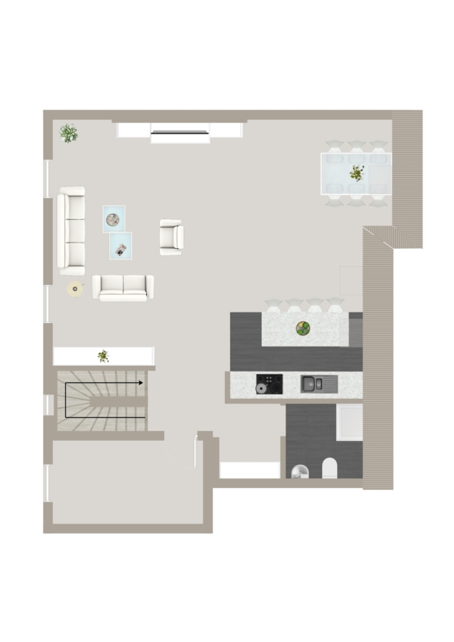 Die obere Ebene entfaltet sich wie ein urbanes Loft voller Licht und Weite: Der offene Wohnbereich verbindet Wohn-, Ess- und Kochbereich auf harmonische Weise, sodass jeder Moment – vom entspannten Frühstück bis zum stilvollen Dinner – zum Erlebnis wird.