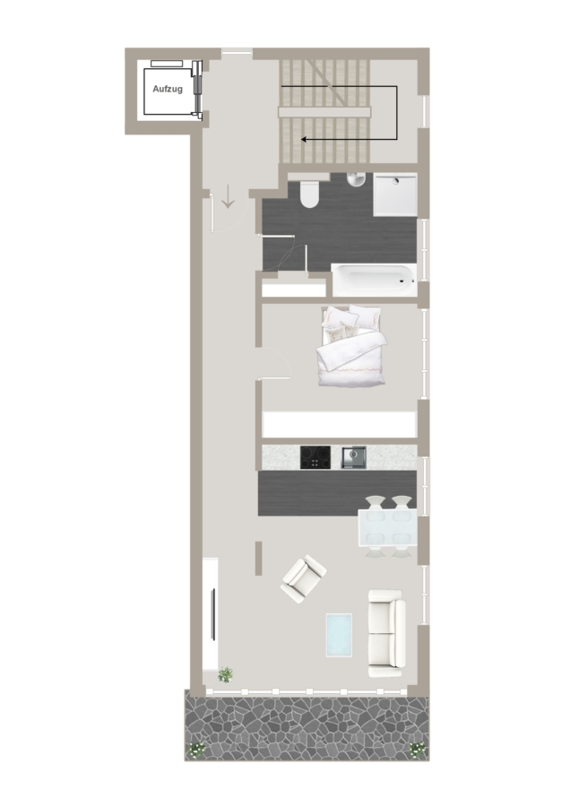 Beim Betreten der Wohnung führt Sie ein geräumiger Flur direkt in den offenen, lichtdurchfluteten Wohnbereich. Zur linken Seite befinden sich das ruhig gelegene Schlafzimmer sowie ein modernes Vollbad. Hochwertiges Eichenparkett zieht sich durch alle Wohnräume und sorgt für eine warme, stilvolle Atmosphäre. Das Schlafzimmer überzeugt mit großzügigen Fensterflächen, die den Raum mit Tageslicht fluten, und bietet ausreichend Platz für Einbauschränke oder individuelle Gestaltung. Das Highlight der Wohnung ist zweifellos der offen gestaltete Wohn- und Essbereich: Die elegante Einbauküche fügt sich harmonisch ein, während die bodentiefe Fensterfront den Raum optisch erweitert und nahtlos auf die eigene Terrasse überleitet – ein Ort mit ganz besonderem Flair, der zum Verweilen, Genießen und Ankommen einlädt.